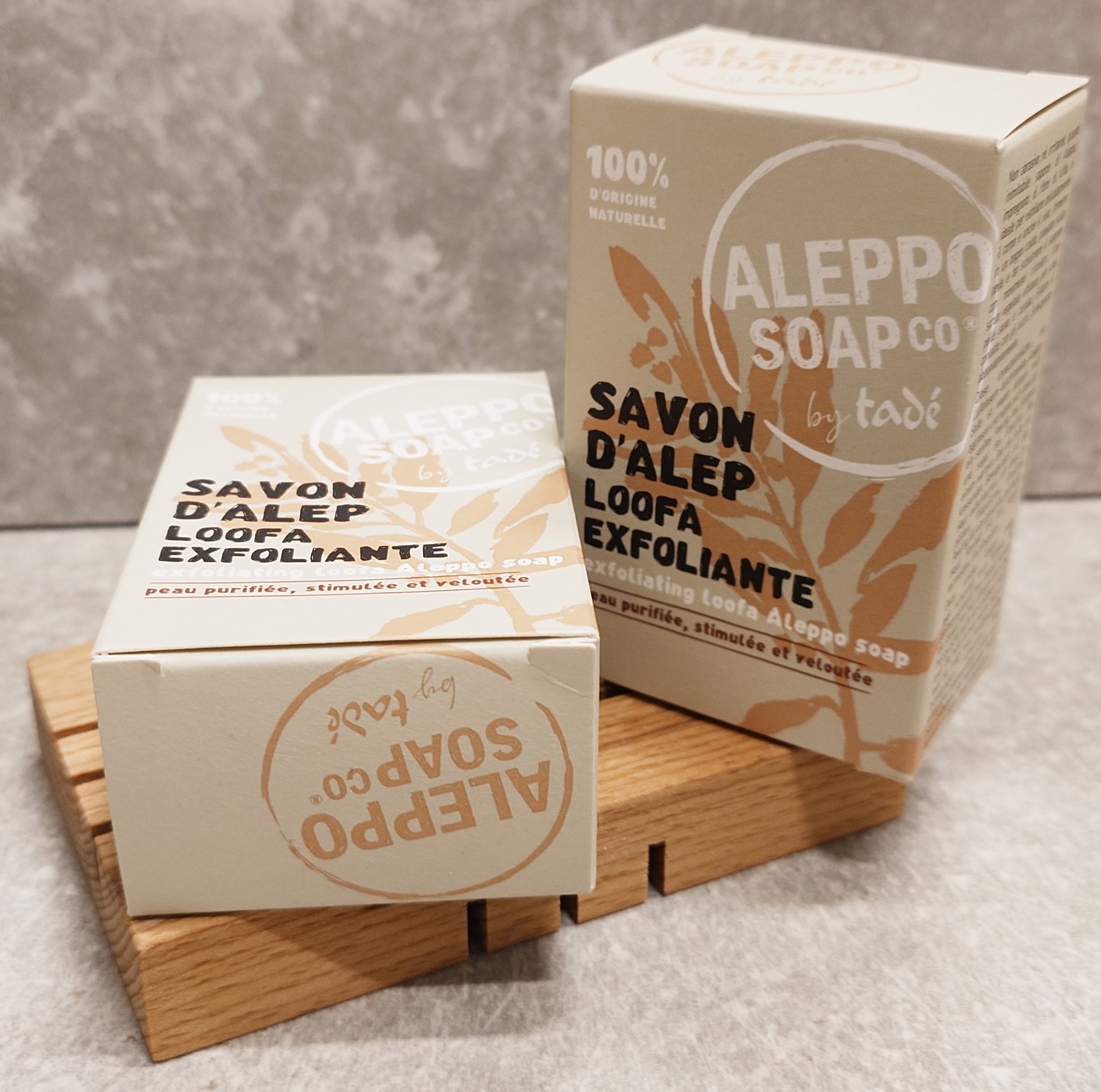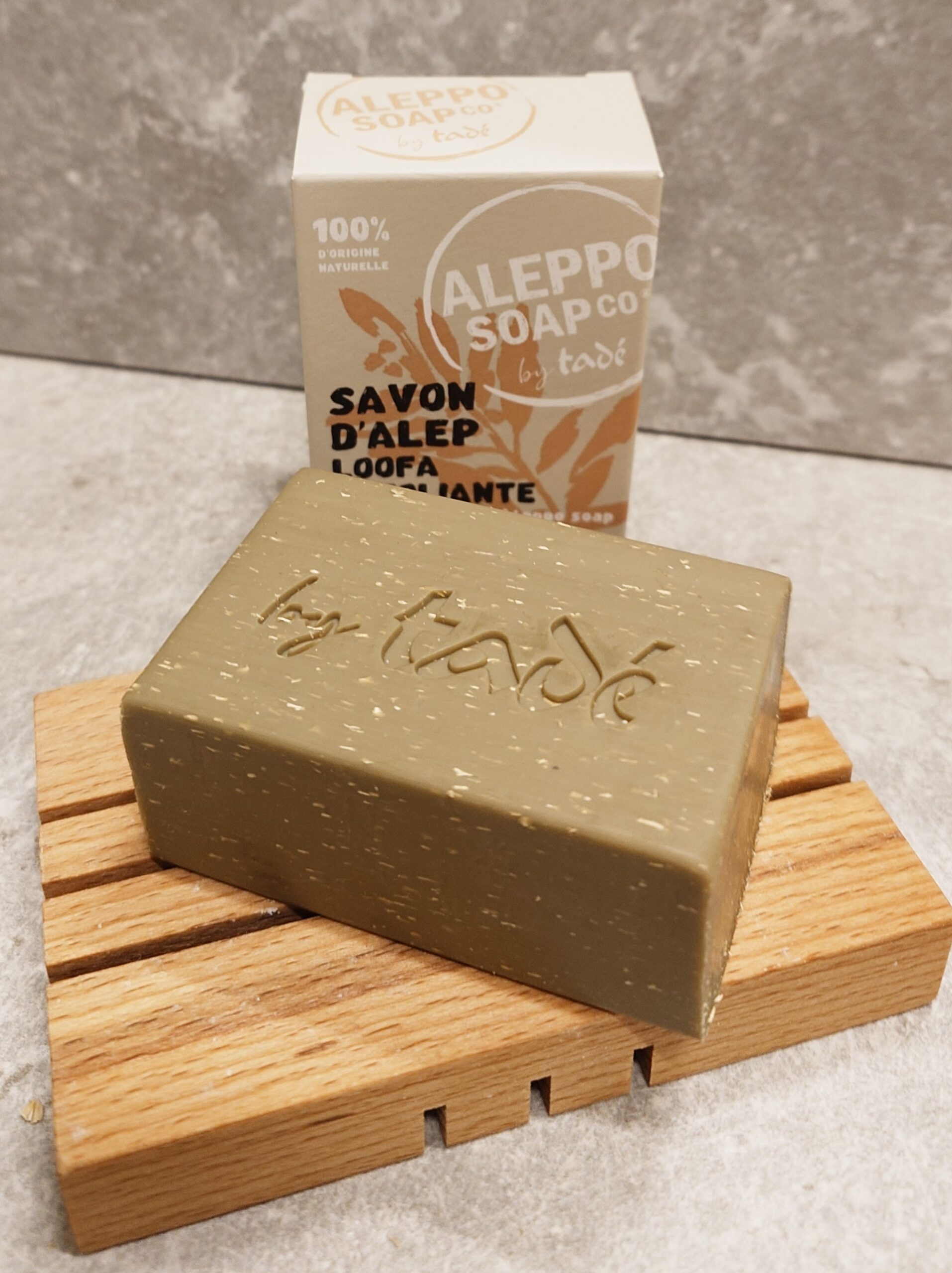 Aleppotvål med exfolierande Luffa. Lämplig för alla hudtyper, även torr hy.