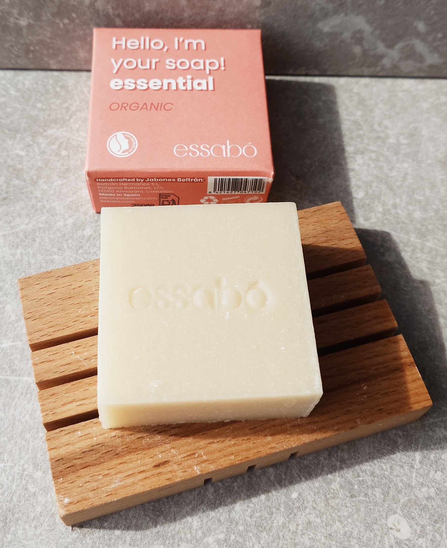 Essential Essabó är en kosmetisk badtvål aromatiserad med eteriska oljor av lavendel, kanel och apelsin. Basen är gjord med hållbart odlad kokosolja och olivolja från spanska biologiska grödor.