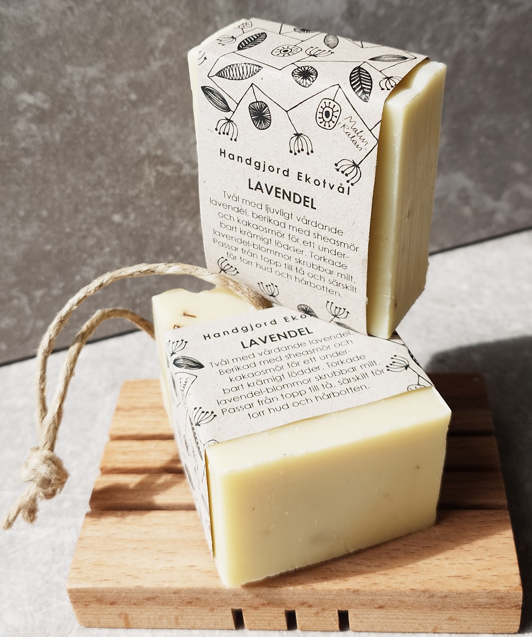 Skötsel: Tvålarna trivs bäst om de får hänga eller ligga luftigt, tex på ett tvålfat i trä eller luffakudde. Det kan också vara bra att växla mellan två tvålar, då hinner de torka upp mellan användningarna och räcker längre!