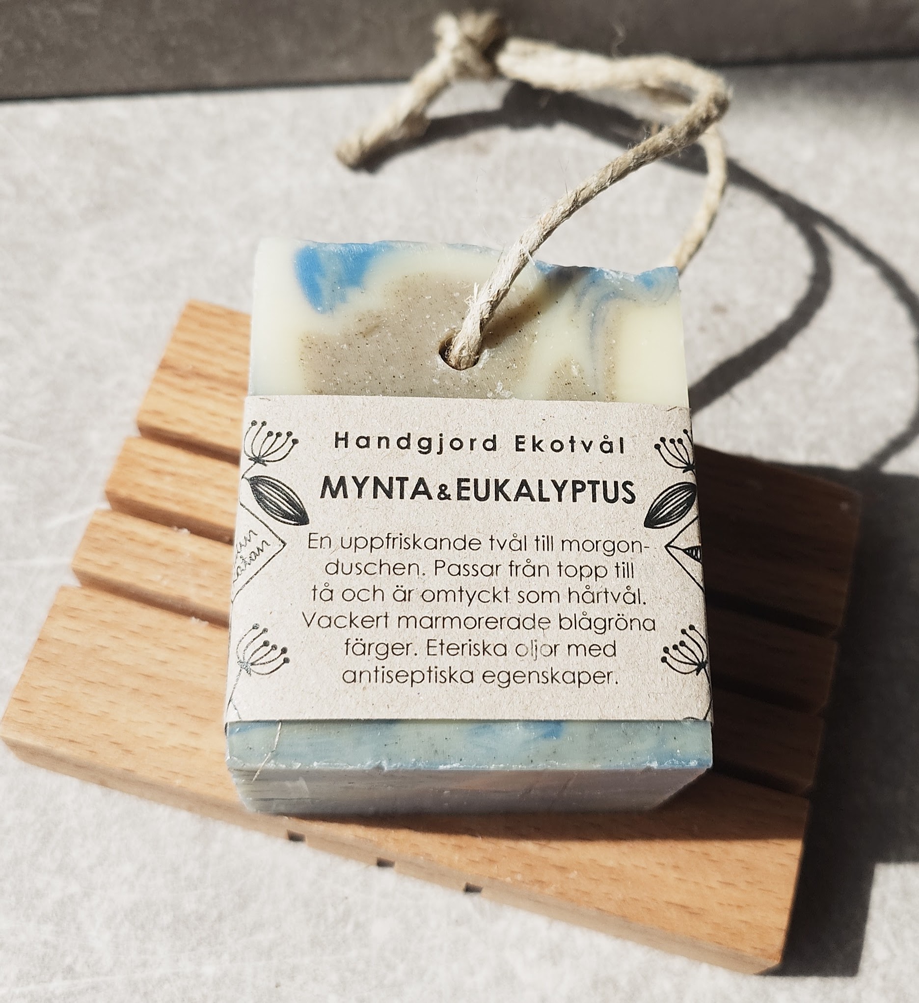 Skötsel: Tvålarna trivs bäst om de får hänga eller ligga luftigt, tex på ett tvålfat i trä eller luffakudde. Det kan också vara bra att växla mellan två tvålar, då hinner de torka upp mellan användningarna och räcker längre!
